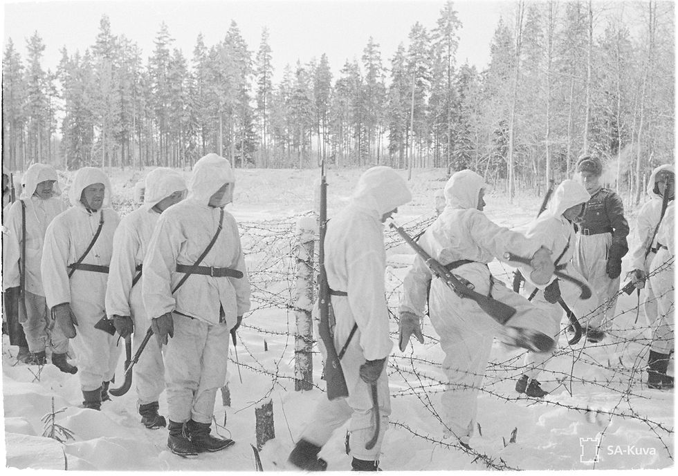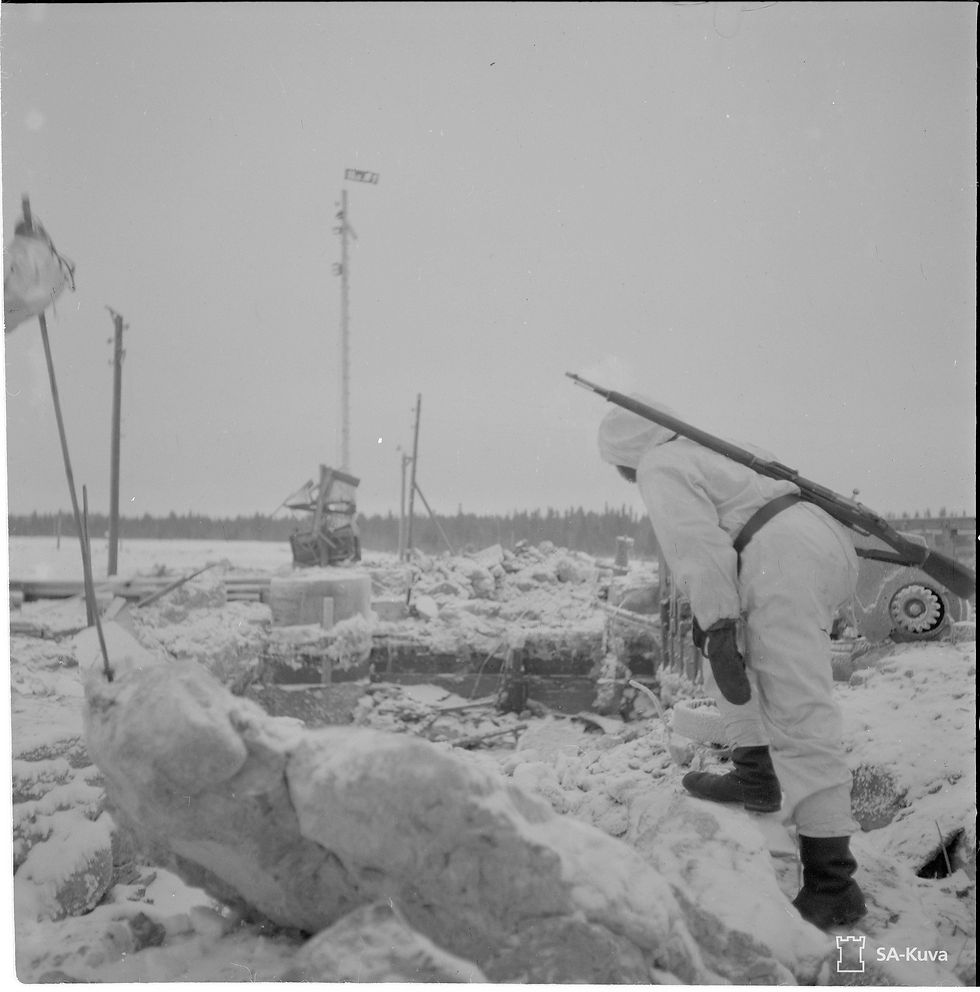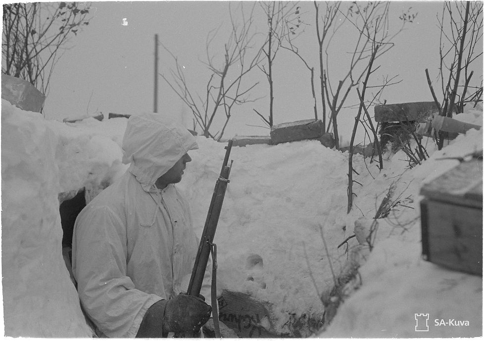 A Finnish soldier on post during Christmas night with an M91 on the Karelian Isthmus